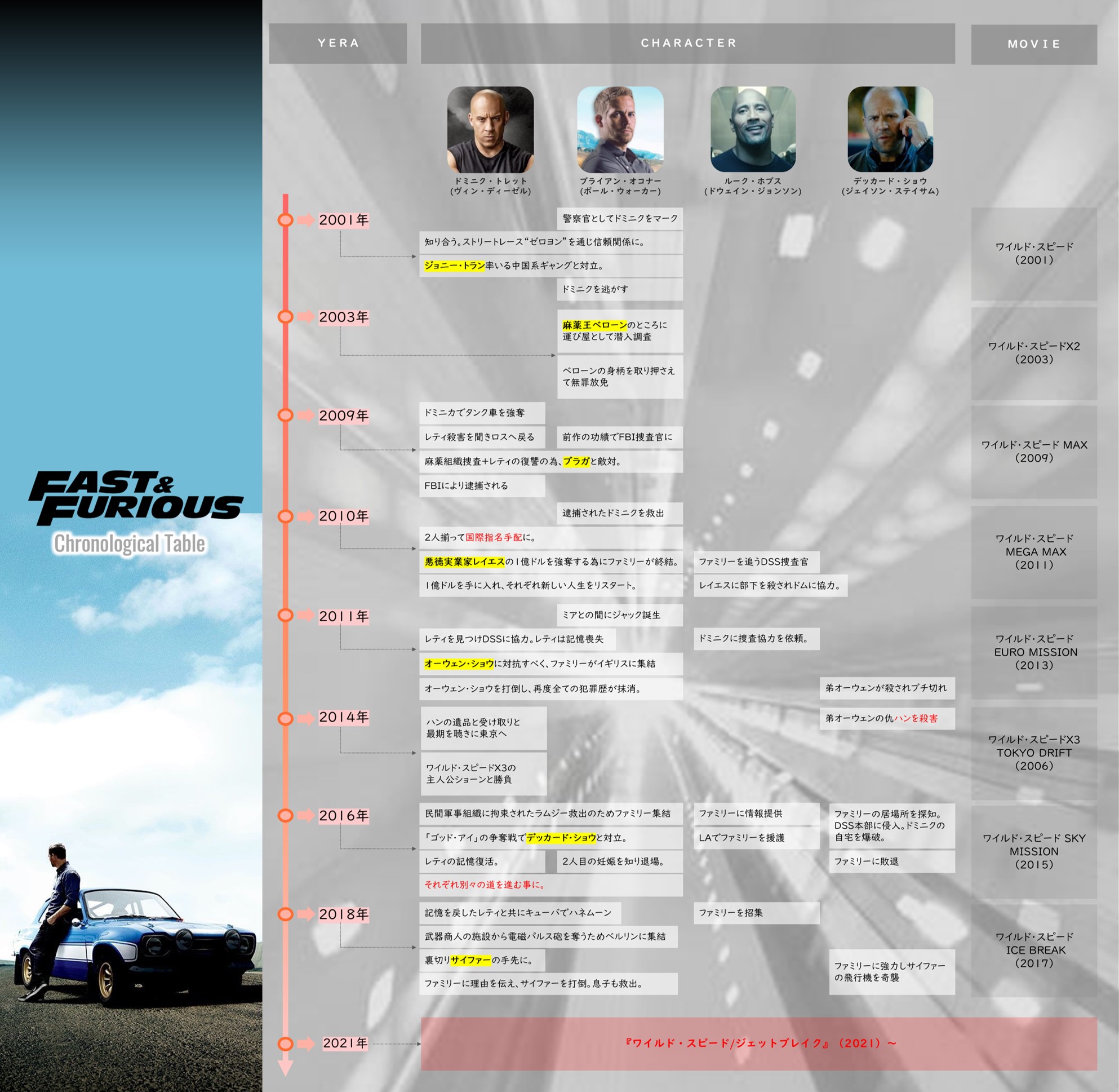 『ワイルドスピード』シリーズ全8作品での経過時間が判明したので、それに基づいた年表がコチラ。